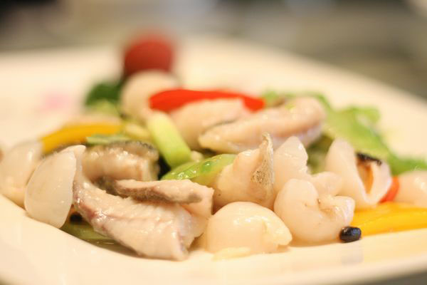 魚(yú)肉是非常軟嫩的食材,尤其是東星斑這樣的魚(yú)肉,更加細(xì)嫩。如果按照大家的理解,先上漿后滑油再翻炒,一來(lái)菜肴鍋氣不足,二來(lái)魚(yú)肉非常容易被炒散。正確的處理方法:魚(yú)片加入少許蛋清和生粉上漿;不粘鍋內(nèi)放入少許色拉油,待油溫升至四五成熱時(shí),放入魚(yú)片,利用中火加熱至八成熟,然后搭配輔料炒制。